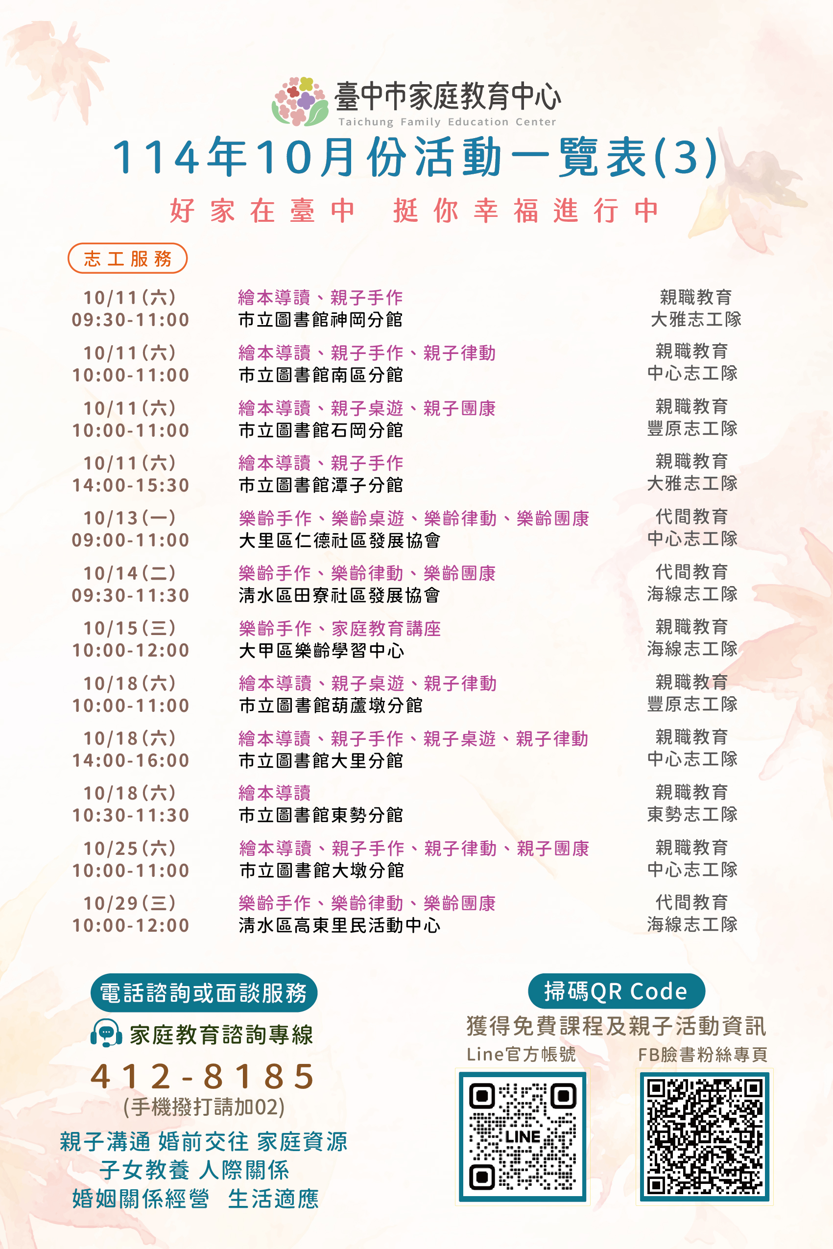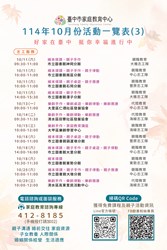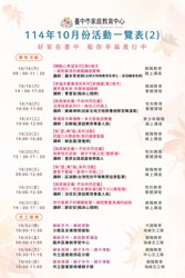 臺中市家庭教育中心辦理114年10月份活動一覽表及文宣各1份,請民眾踴躍報名參加