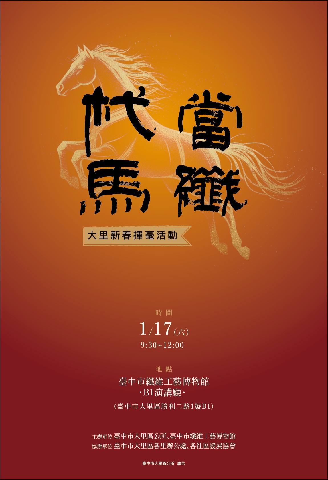 本所將與臺中市纖維工藝博物館共同舉辦「杙馬當纖~大里新春揮毫活動」,歡迎各位里民一起來熱鬧領春聯!