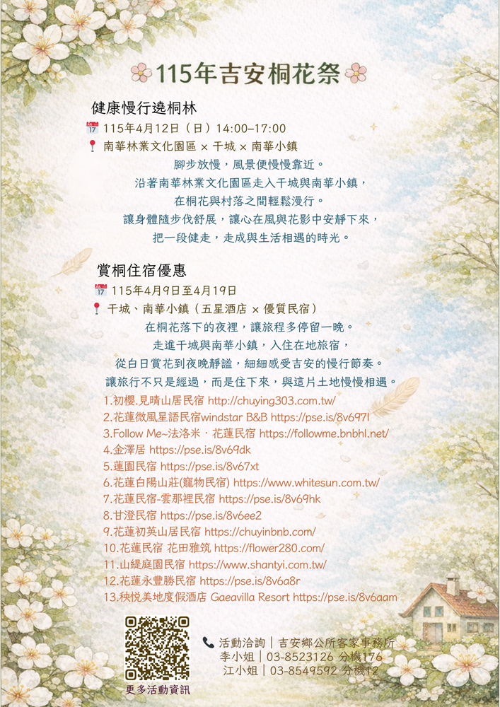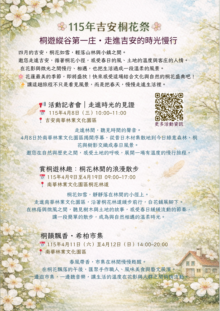 轉傳:花蓮縣吉安鄉公所辦理「2026吉安桐花祭-桐遊縱谷第一庄・走進吉安的時光慢行」活動
